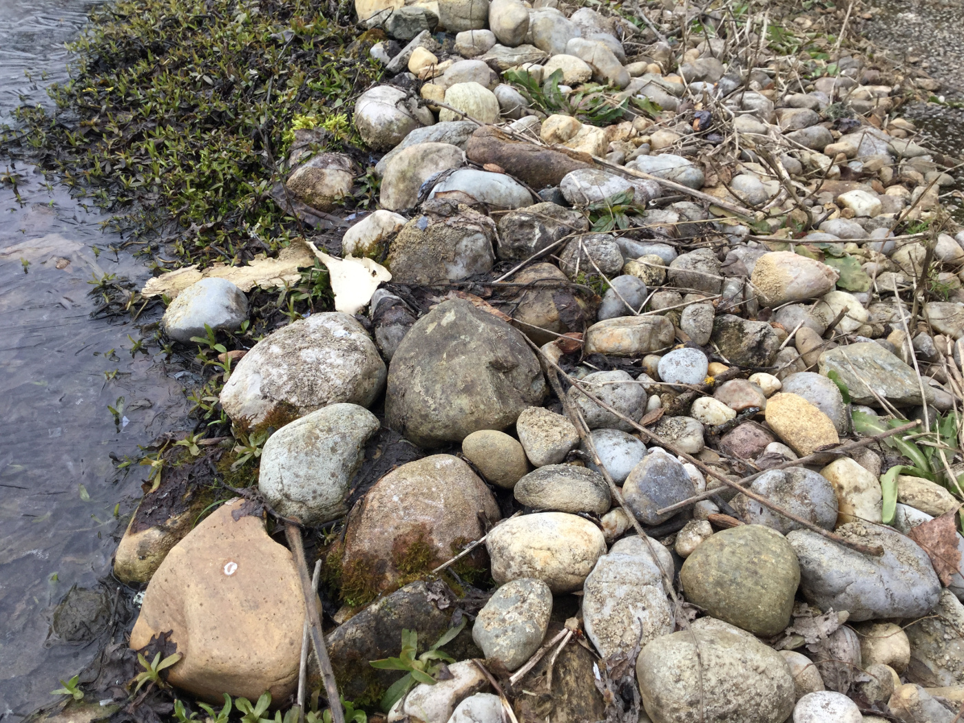 Im Idealfall deckt man die Folie am Rand mit gröberen Steinen ab. Sie entwickeln keine Kapillarwirkung und man kann sie am Anfang auch leicht wieder entfernen, um die Folie an einer Stelle etwas anzuheben oder abzusenken. Damit lässt sich beispielsweise der Überlauf, der bei Sommergewittern beträchtlich sein kann, in bestimmte Bahnen lenken.