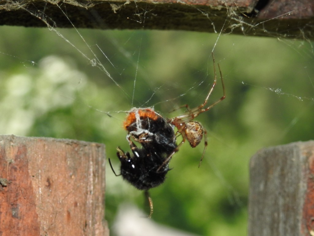 Und überall lauern gefährliche Spinnen in allen Größen. Zuweilen verfängt sich eine Hummel zwischen den Latten der Tür in den Spinnweben. Normalerweise reißt sie sich gleich wieder los. Wenn doch einmal eine Steinhummel hängen bleibt, hilft es wenig, sie zu befreien. Von den verklebten Flügeln kann sie sich die Spinnweben nur sehr schwer abstreifen. Wäre besser gewesen, ich hätte in Ruhe ein paar gescheite Fotos gemacht.