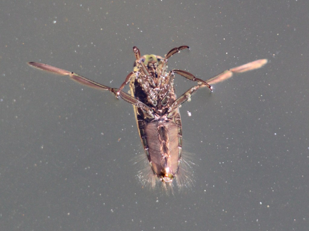 Nach ihrem Einsatz kommen sie selbstverständlich zurück in den Teich. Rückenschwimmer können nämlich fliegen, um von einem Gewässer ins nächste zu gelangen. Dafür müssen sie aber an Land klettern und ihre Flügel trocknen. Den Start habe ich noch nie gesehen, aber die Landung ist witzig. Das Tier lässt sich einfach ins Wasser fallen. Es macht kurz Plopp, und dann steigt der Rückenschwimmer an die Oberfläche. Für den Auftrieb ist die Atemluftreserve verantwortlich.