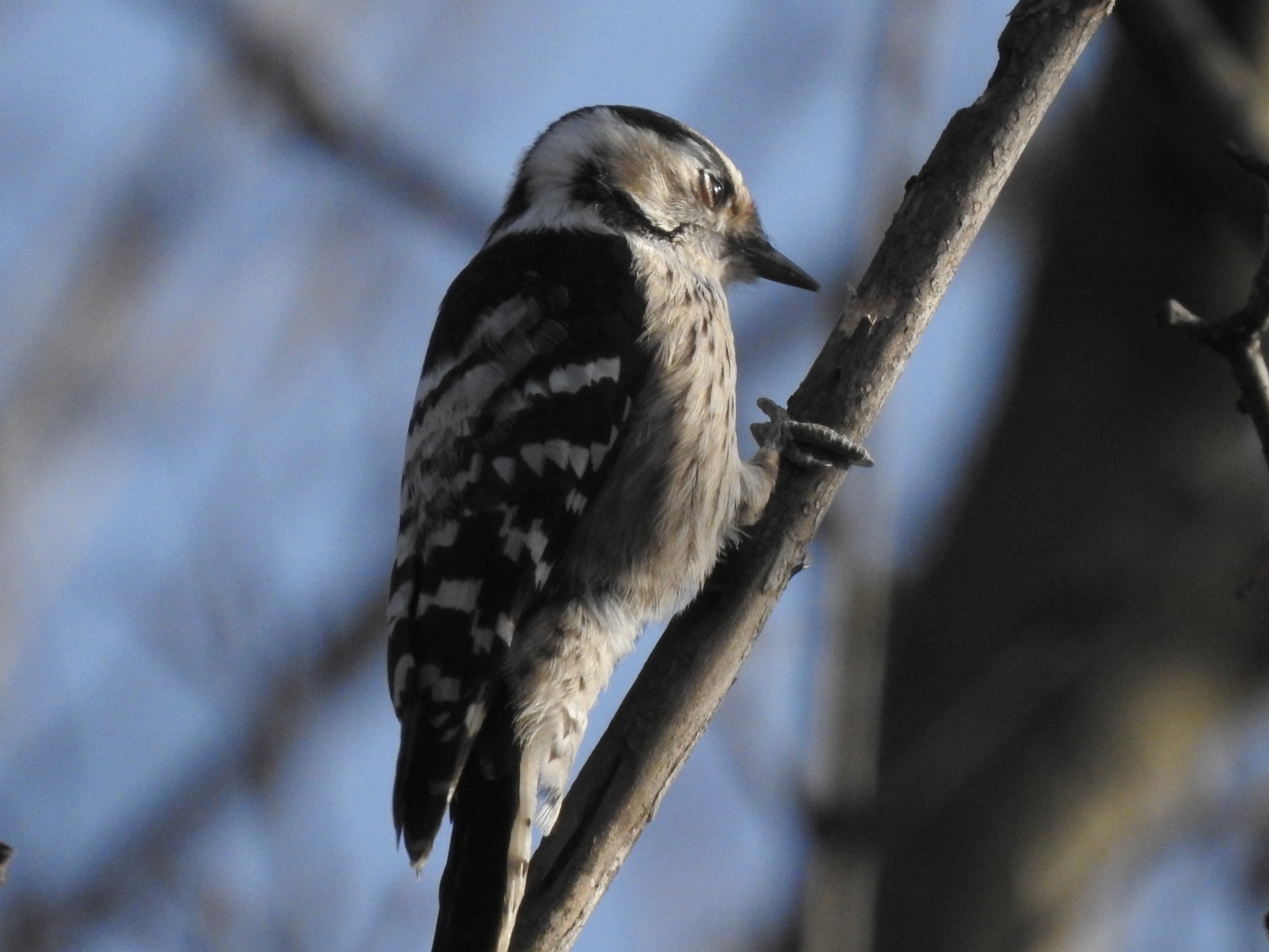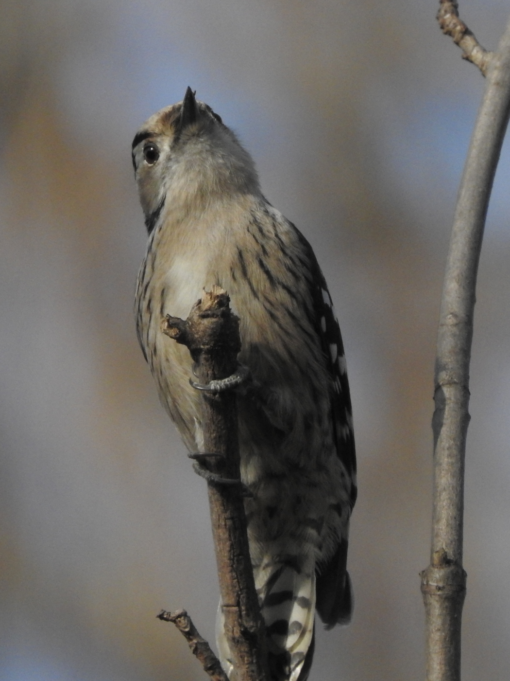 Ich habe einen Vogel entdeckt, der kaum größer ist als eine Kohlmeise und hoch oben ausgesprochen lebendig durch die Äste turnt. Es ist ein weiblicher Kleinspecht, die Männchen haben eine rote Kappe. Diese kleinen Verwandten des Buntspechts sind eigentlich weit verbreit, aber nirgends häufig. Der Prater mit seinem naturbelassenen Baumbestand und dem vielen Totholz bietet ihnen einen perfekten Lebensraum und mir dadurch die Gelegenheit für ein paar Fotos.