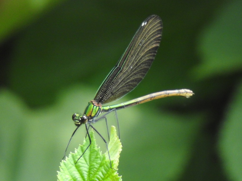 Das erste Foto zeigt ein Männchen, das zweite ein Weibchen. Die Prachtlibellen sind oft am Teich zu Gast, obwohl sie ausschließlich in fließenden Gewässern laichen.