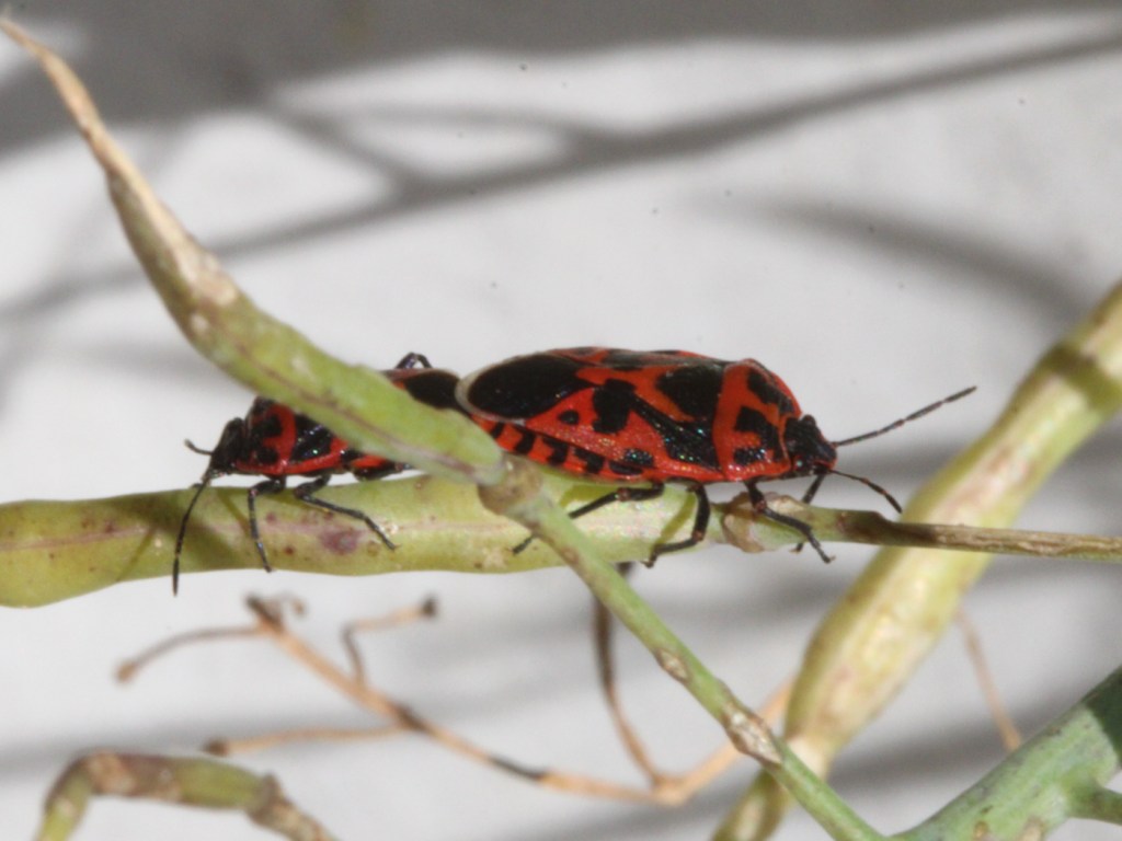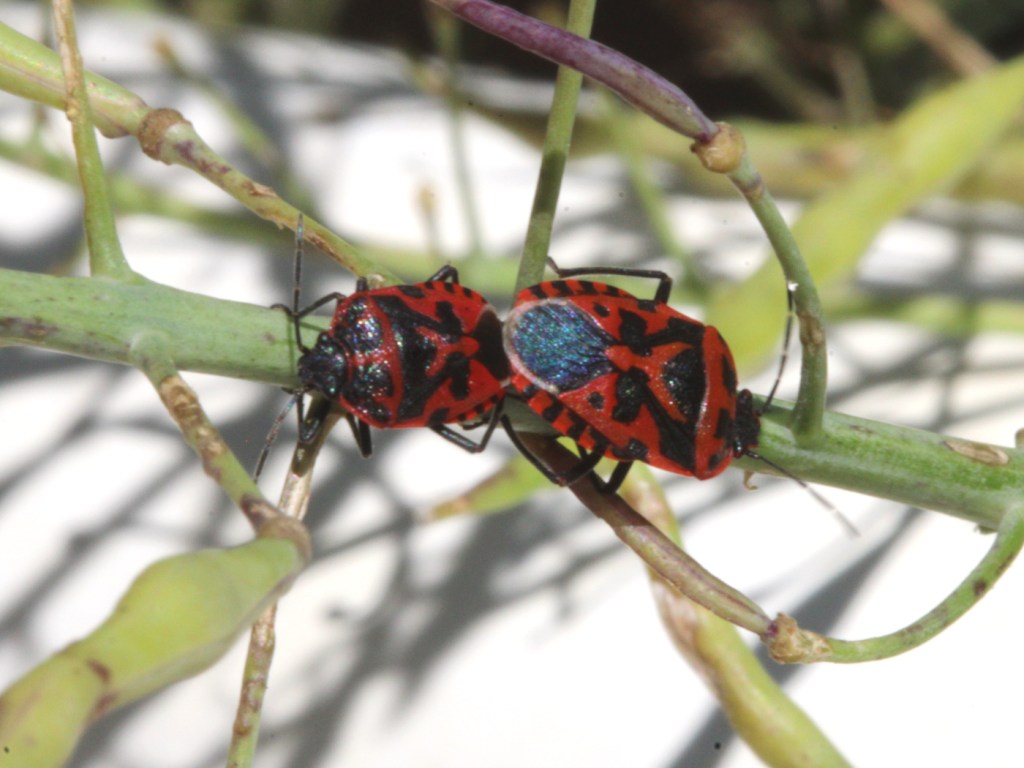 Auf den ersten Blick denkt man vielleicht an Feuerwanzen, die im Volksmund auch Schusterwanzen heißen. Aber die beiden tun nur so. Es gibt aus irgend einem Grund bei den Wanzen eine Vorliebe für den exakt gleichen Rotton. Nur die schwarzen Flecken sind anders angeordnet.
