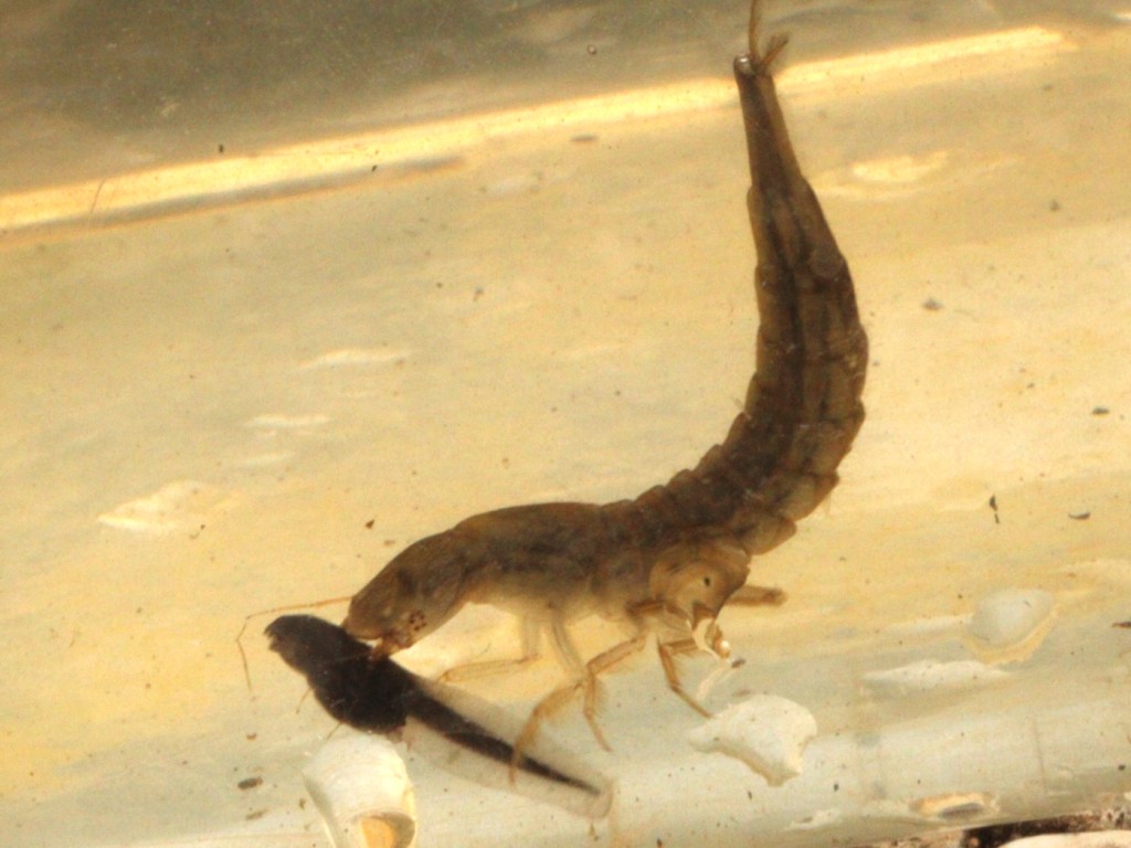 Das sind die Larven der Gelbrandkäfer, die sich durch die Ruderbewegung der Beine beim Schwimmen und das fast immer gekrümmte Hohlkreuz deutlich von Libellenlarven unterscheiden. Dass man sie ständig fressen sieht, liegt nicht nur an ihrem Appetit, sondern auch daran, dass sie ihre Nahrung außen verdauen müssen. Dazu spritzen sie Verdauungssäfte in das Opfer, und es dauert seine Zeit, bis sich deren Wirkung entfaltet und sie anschließend den entstandenen Nahrungsbrei einsaugen können.