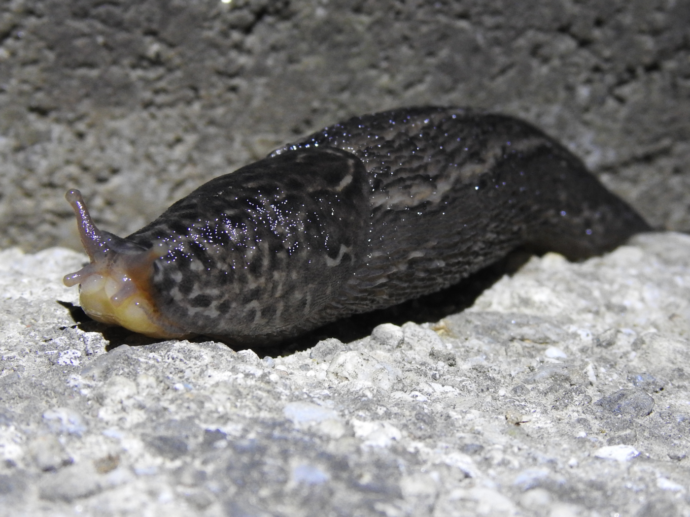Den Tigerschnegel auf dem Foto kenne ich schon länger. Er ist dunkler als seine Artgenossen und wohnt unter einem bestimmten Steinhaufen. Er beginnt seinen nächtlichen Streifzug meist zielstrebig in östliche Richtung. Den Unterschlupf teilt er sich mit einem helleren Exemplar. Der Kollege hat es nicht so eilig und folgt mit ein paar Metern Abstand.