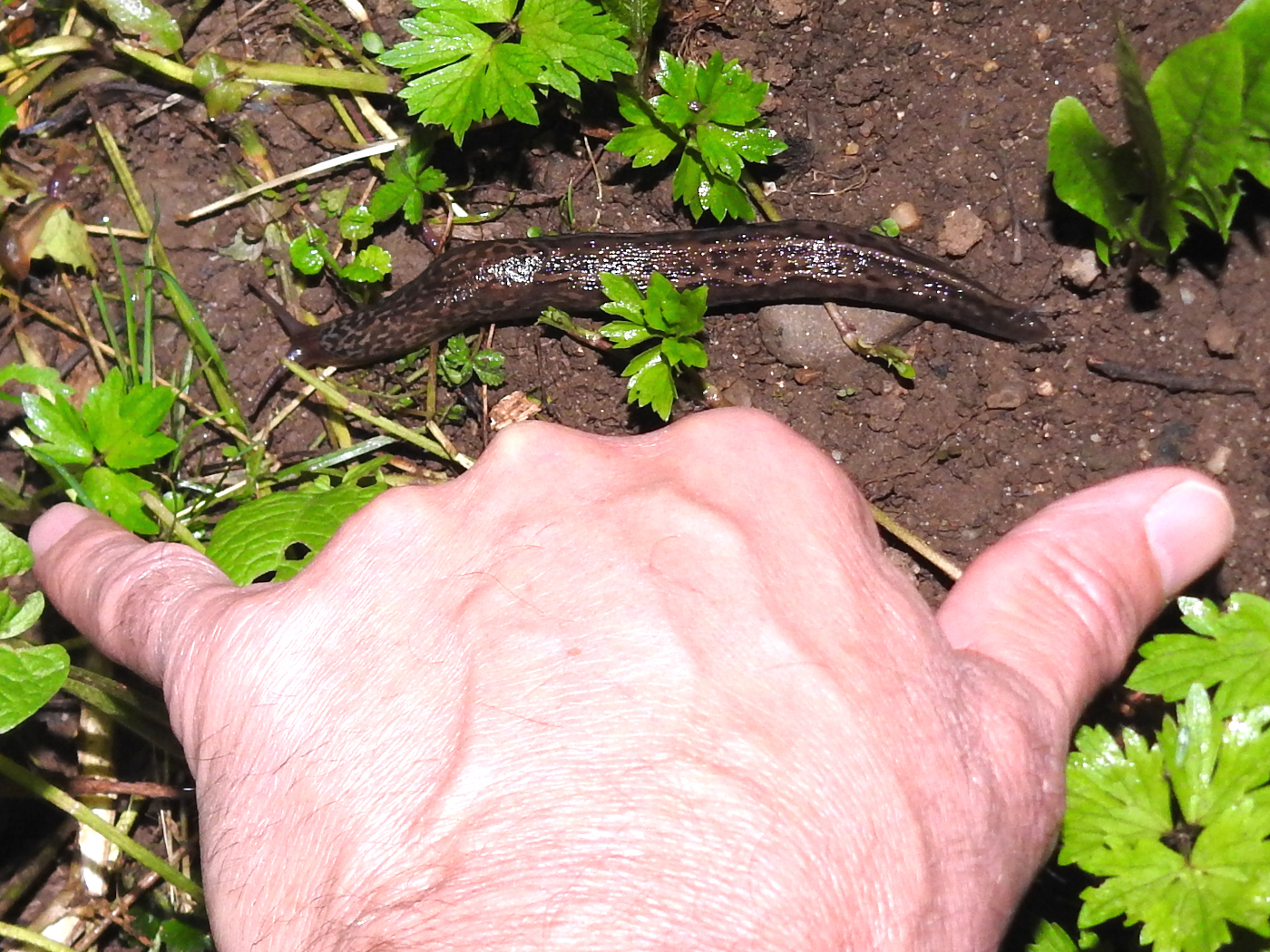 Eigentlich sollte ich das wissen, denn der abendliche Streifzug mit Stirnlampe ist für mich eine regelmäßige Übung, und meine Aufmerksamkeit gilt dabei oft den Schnecken. Schließlich will ich mein Gemüse behalten. Übers Jahr verteilt ist der Tigerschnegel dabei die häufigste Schneckenart, die ich im Garten finde. Was die Körpermasse betrifft, dominiert er das Geschehen sowieso, denn die Tiere sind riesig. So um die 17 Zentimeter werden ausgewachsene Exemplare bei uns.
