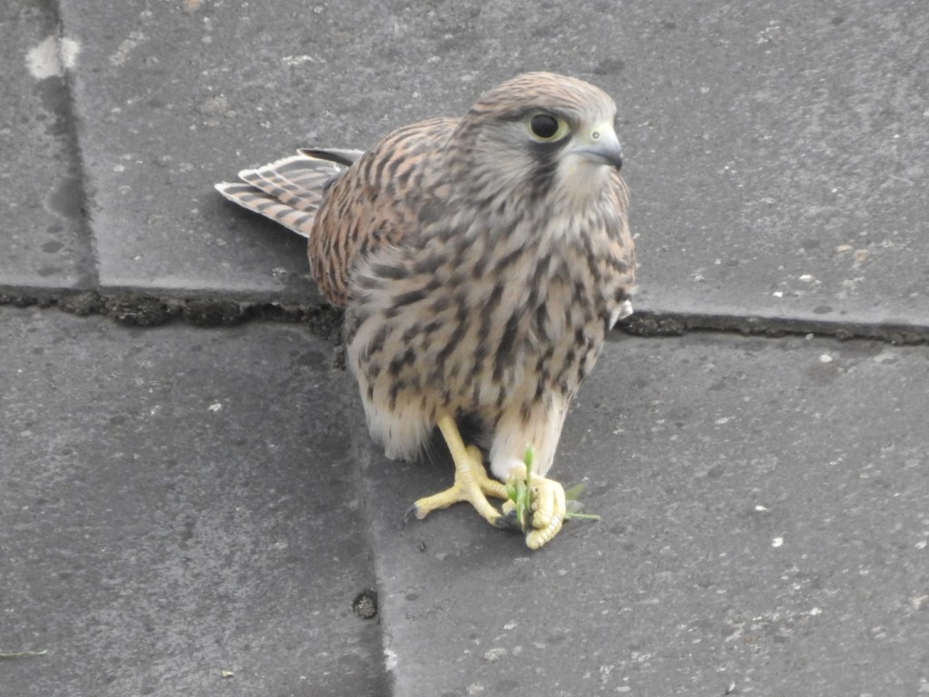 Der Jungvogel auf dem Dach hielt Futter in den Krallen, das er genüsslich verspeiste. Erst am Computer entdeckte ich, dass es sich anscheinend um eine Heuschrecke handelte. Die hatte sich wohl gründlich verflogen und wurde so zum Grünfutter für den Turmfalken. In Zukunft wird er sich von Nagetieren ernähren wie seine Artgenossen, aber das erste selbst gefangene Futter schien ihm gut zu schmecken.