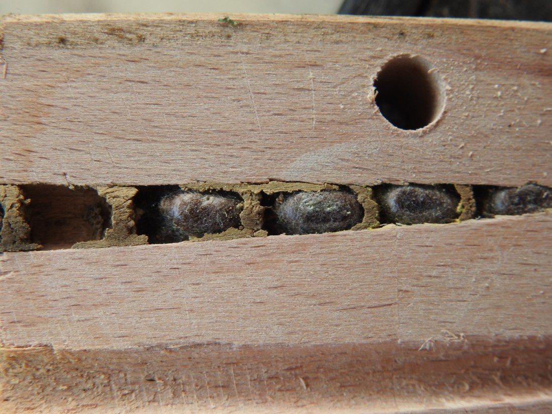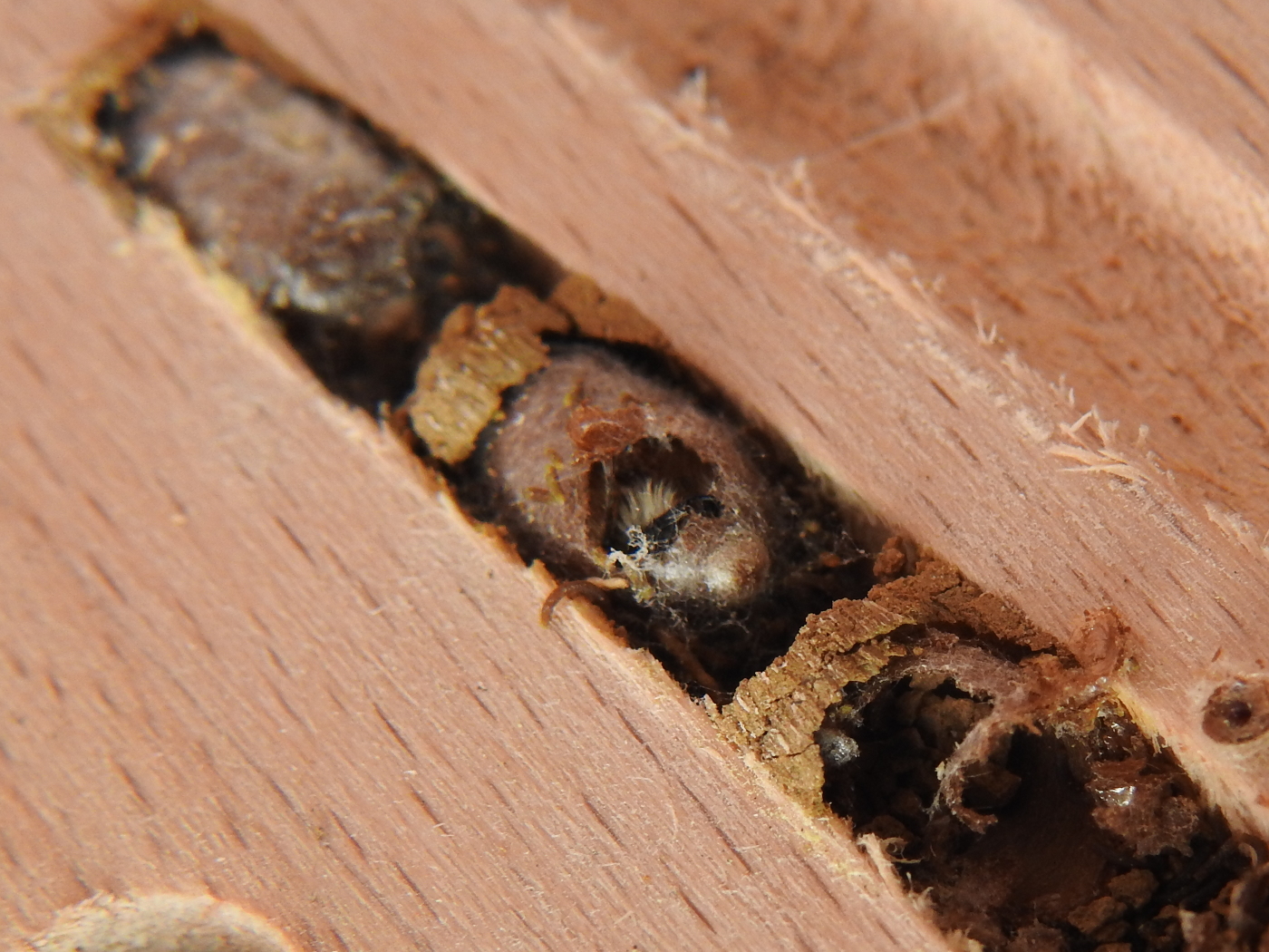 Es ist für mich immer schwierig, einen Blog-Beitrag über einen Misserfolg zu schreiben, dabei wären vielleicht auch solche abschreckenden Beispiele sinnvoll, also habe ich mir gedacht, ich verbinde die Beschreibung der Fehlkonstruktion mit ein paar spektakulären Bildern aus dem Inneren einer Brutröhre. Die Aufnahmen waren allerdings mäßig. Dass die erste Kammer oft leer bleibt, ist keine tolle Erkenntnis, das mussten unsere Kohlmeisen schon vor Jahren beim Aufpecken frustriert feststellen. Und mit den tollen Aufnahmen von geöffneten Brutkammern, wie man sie aus Wildbienen-Büchern kennt, waren meine Fotos nicht vergleichbar. Also verwarf ich den Beitrag wieder und legte alles auf die Seite.