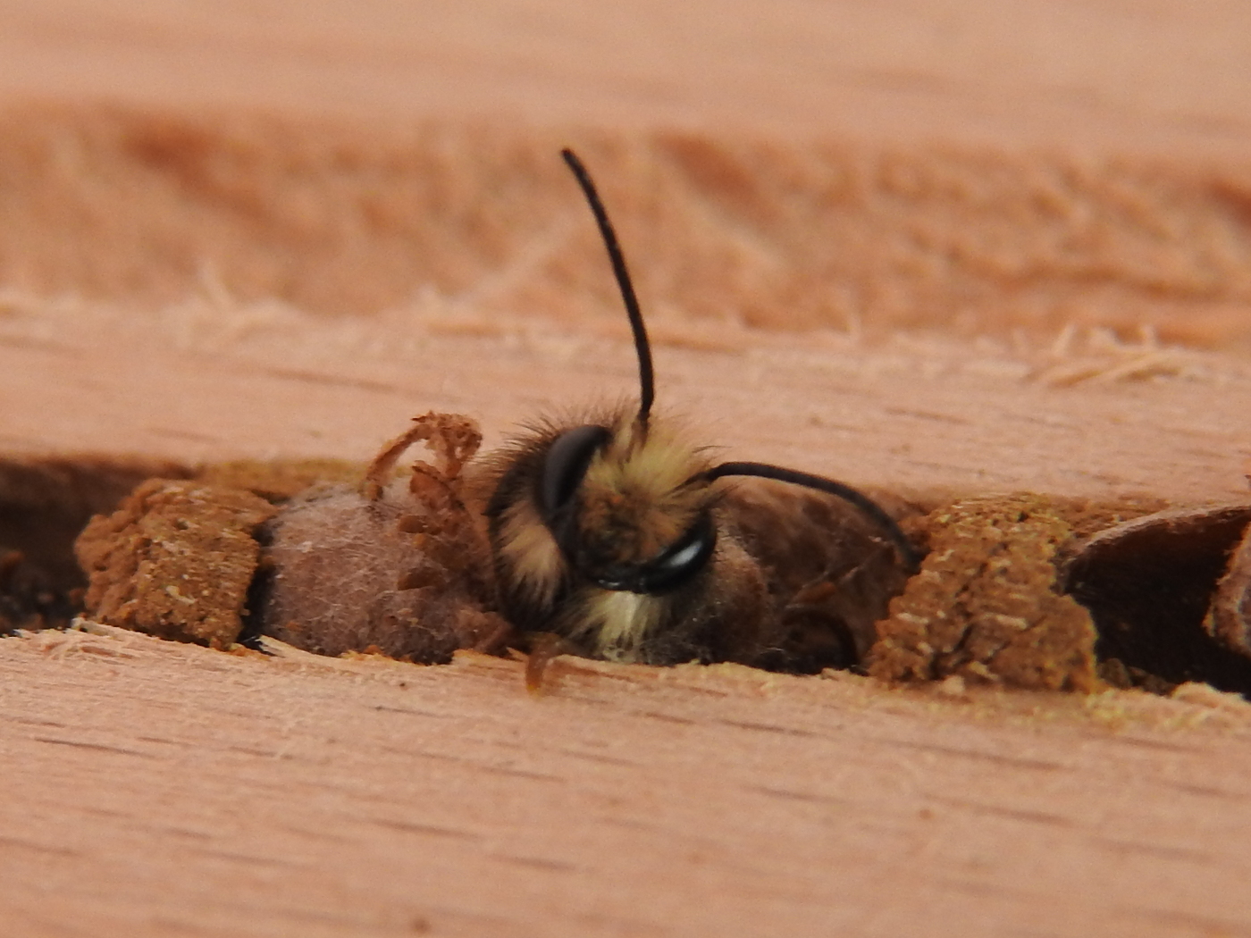 Sie sah direkt in die Kamera. Der erste Blick auf die Welt galt quasi mir. Es ist immer ein erhebendes Gefühl, eine Geburt mitzuerleben, und man weiß ja, wenn erst einmal der Kopf durch ist, kann nichts mehr passieren, dann ist der Rest eine Kleinigkeit. Man kann quasi schon den Sekt einkühlen, bei Menschen – nicht so bei Mauerbienen. Das kleine Kerlchen zog sich wieder in seinen Kokon zurück und verharrte für den Rest des Nachmittags bewegungslos.