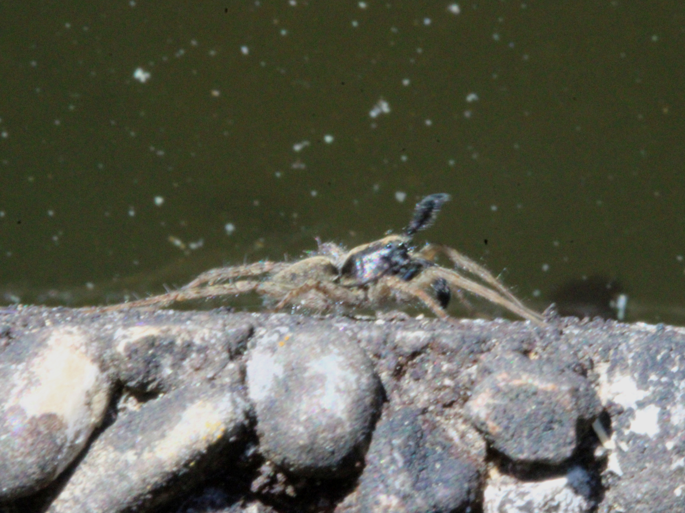 Die Männchen sind dunkler als die Weibchen, und wenn sie die Pedipalpen heben wie dieses Exemplar, dann sind sie paarungsbereit, denn mit diesen Tastorganen im Kopfbereich übertragen sie das Sperma. Das Weibchen versteckte sich zunächst noch zwischen der Waschbetonplatte und der Wasseroberfläche, ließ sich aber heranlocken, indem das Männchen rhythmisch mit den Füßen klopfte.