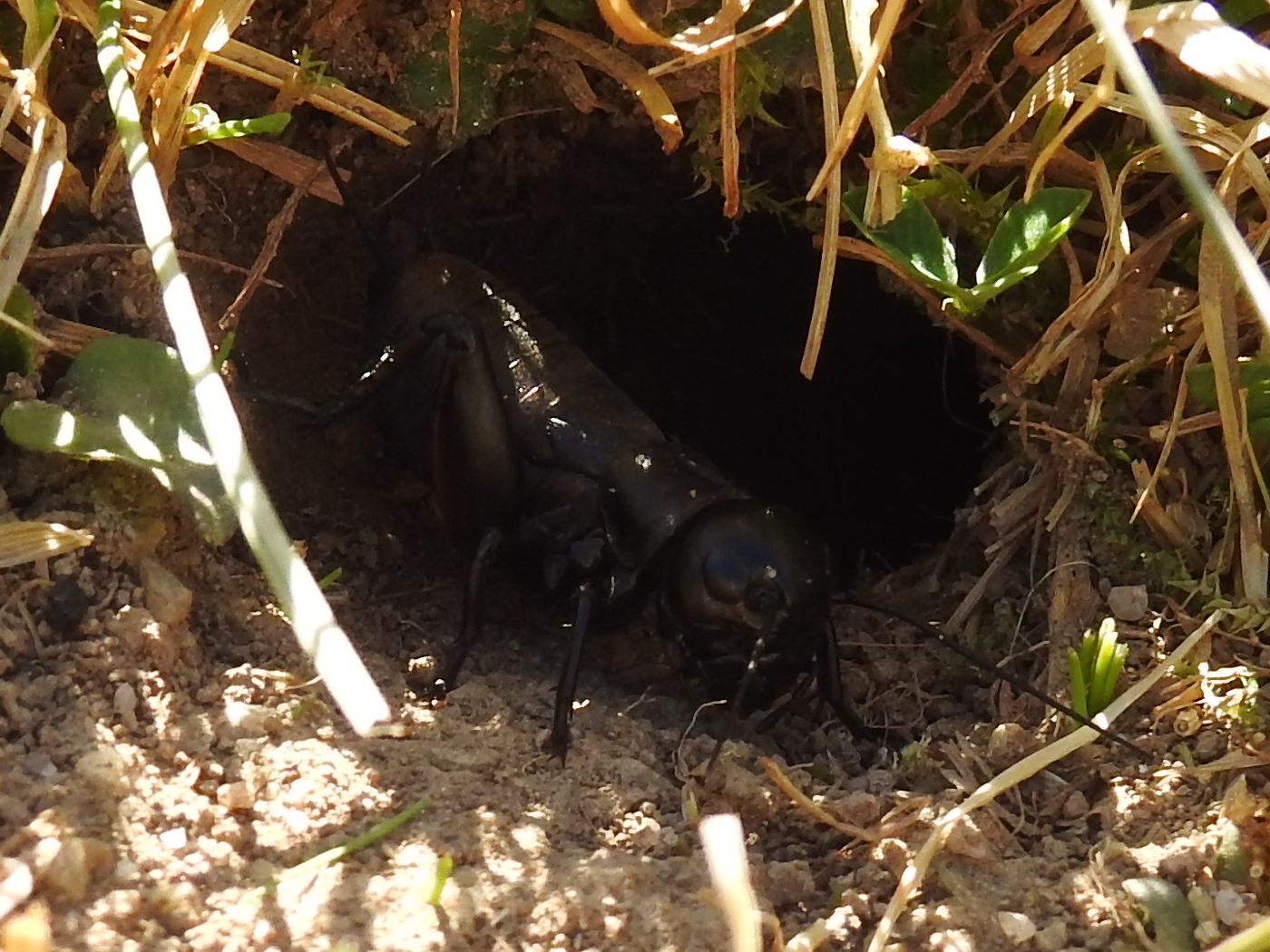Fliegen können beide Geschlechter nicht, das heißt, sie müssen auf dem Boden wandern, und so kann man auch die Weibchen relativ leicht entdecken. Wenn man sich einem Bau nähert, verschwindet das Männchen sofort im Inneren und damit ist es plötzlich still. Jetzt muss man nur noch das Gras in der Umgebung erkunden. Irgendwo zwischen den Halmen wartet ein Weibchen regungslos, bis die Musik wieder einsetzt und es seine Wanderung in der richtigen Richtung fortsetzen kann. So kommt man in der Abenddämmerung mit Lampe zu brauchbaren Fotos.