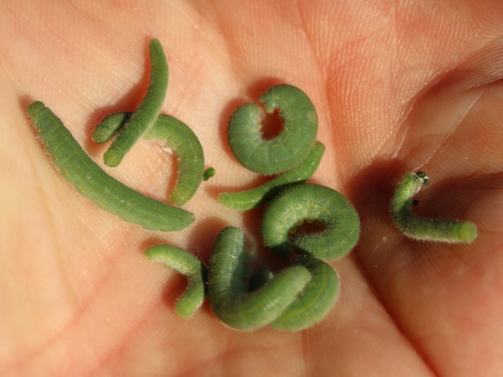 Zum Kleinen Kohlweißling weiß Bellmanns Insektenführer: „Die Eier werden einzeln auf den Futterpflanzen […] abgelegt.“1 Davon weiß der Falter aber nichts. 50 Raupen habe ich schon abgeklaubt und in die Wiese übersiedelt.