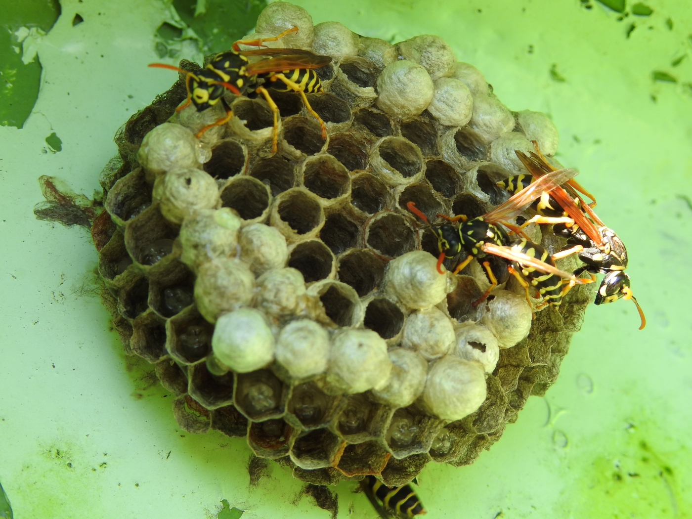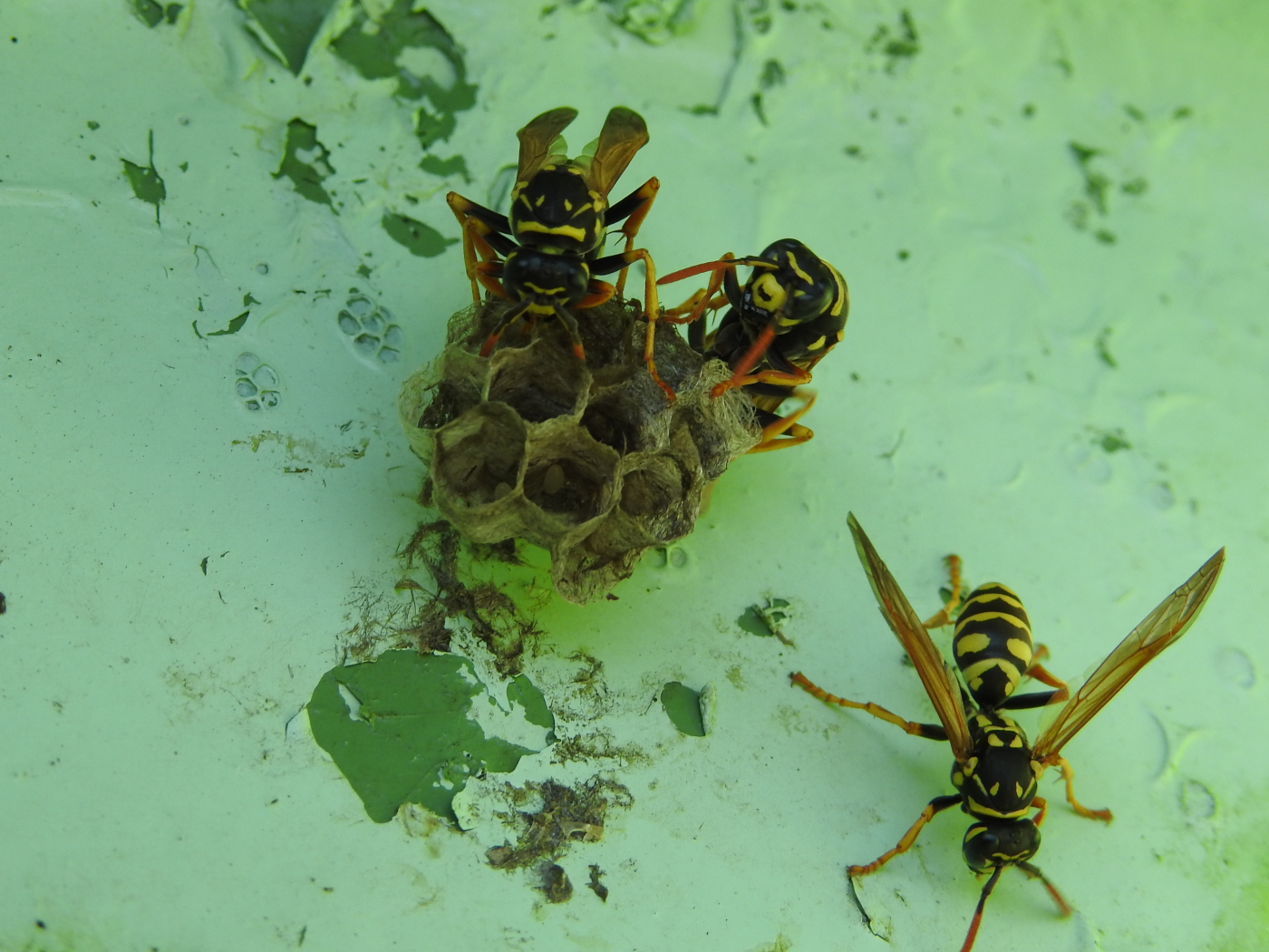 Dieses Jahr musste der Tank frisch gestrichen werden, und ich habe mich schon gefragt, was ich jetzt mit den Wespen machen soll, aber die Tiere denken ja mit und ließen den gewohnten Nistplatz im Frühjahr aus. Französische Feldwespen sind recht wärmeliebend, und ich vermute, die kühle Witterung zu Beginn der Saison hat den Stellungswechsel bedingt.