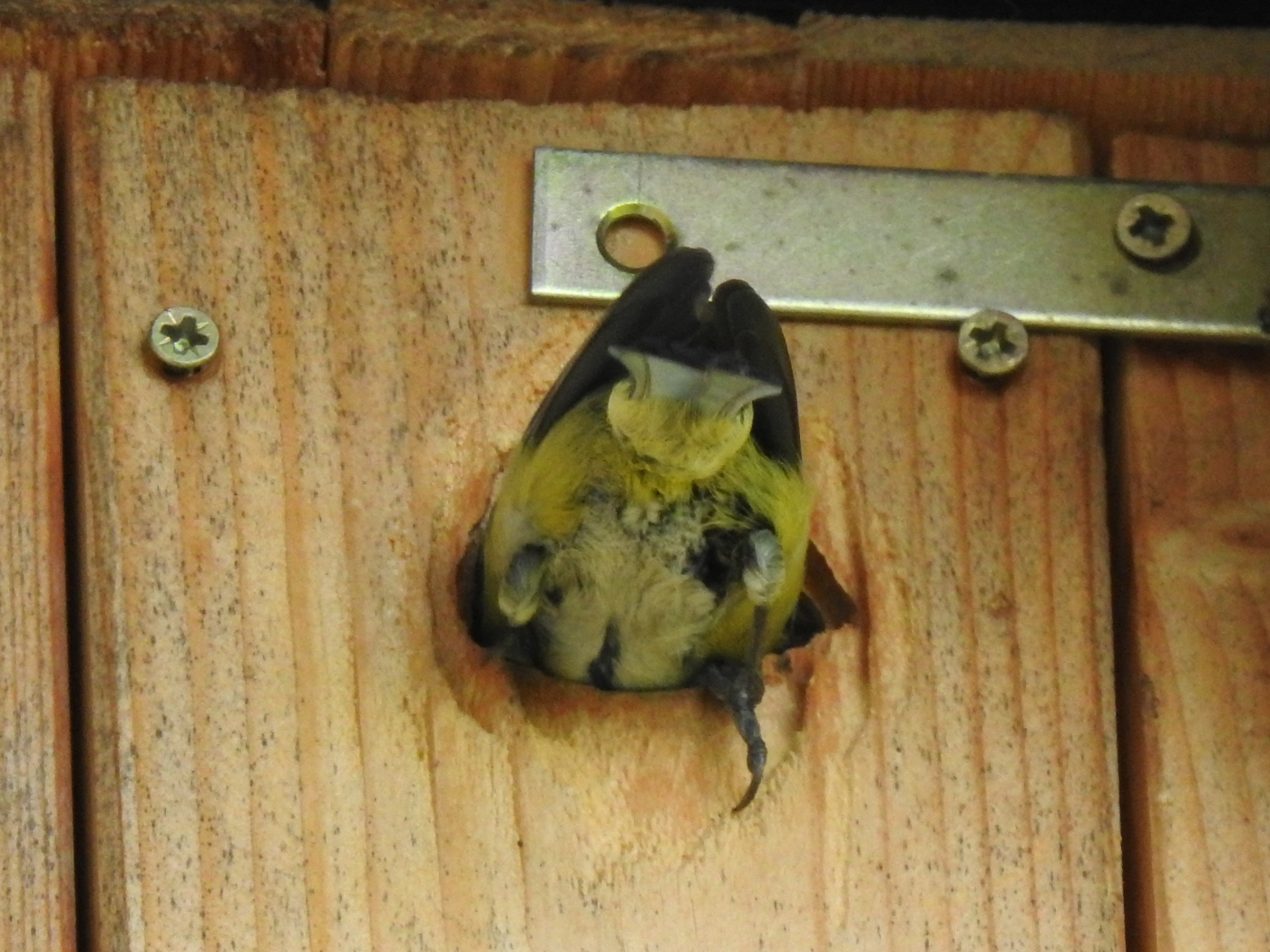Der Sommer ist stressig. Im Minutentakt schleppen die Elternvögel Nahrung heran. Da zählt jede Sekunde, und für effiziente Leistung braucht man gutes Werkzeug. Da muss man selbst die kleinsten Optimierungsmöglichkeiten nützen, und so haben die Blaumeisen ein ergonomisch perfekt angepasstes Schlupfloch geschaffen. Die Höhe ist gleichgeblieben, das sperrt größere Vögel wie die Kohlmeisen weiterhin aus, aber seitlich wurde die Öffnung dem Blaumeisenkörper angepasst. Und noch etwas fällt auf, wenn man genau hinsieht: Die von uns aus rechte Ecke öffnet mehr zur Seite als die linke. Das Loch ist asymmetrisch, aber auch dafür gibt es eine Erklärung, wie das letzte Bild zeigt.