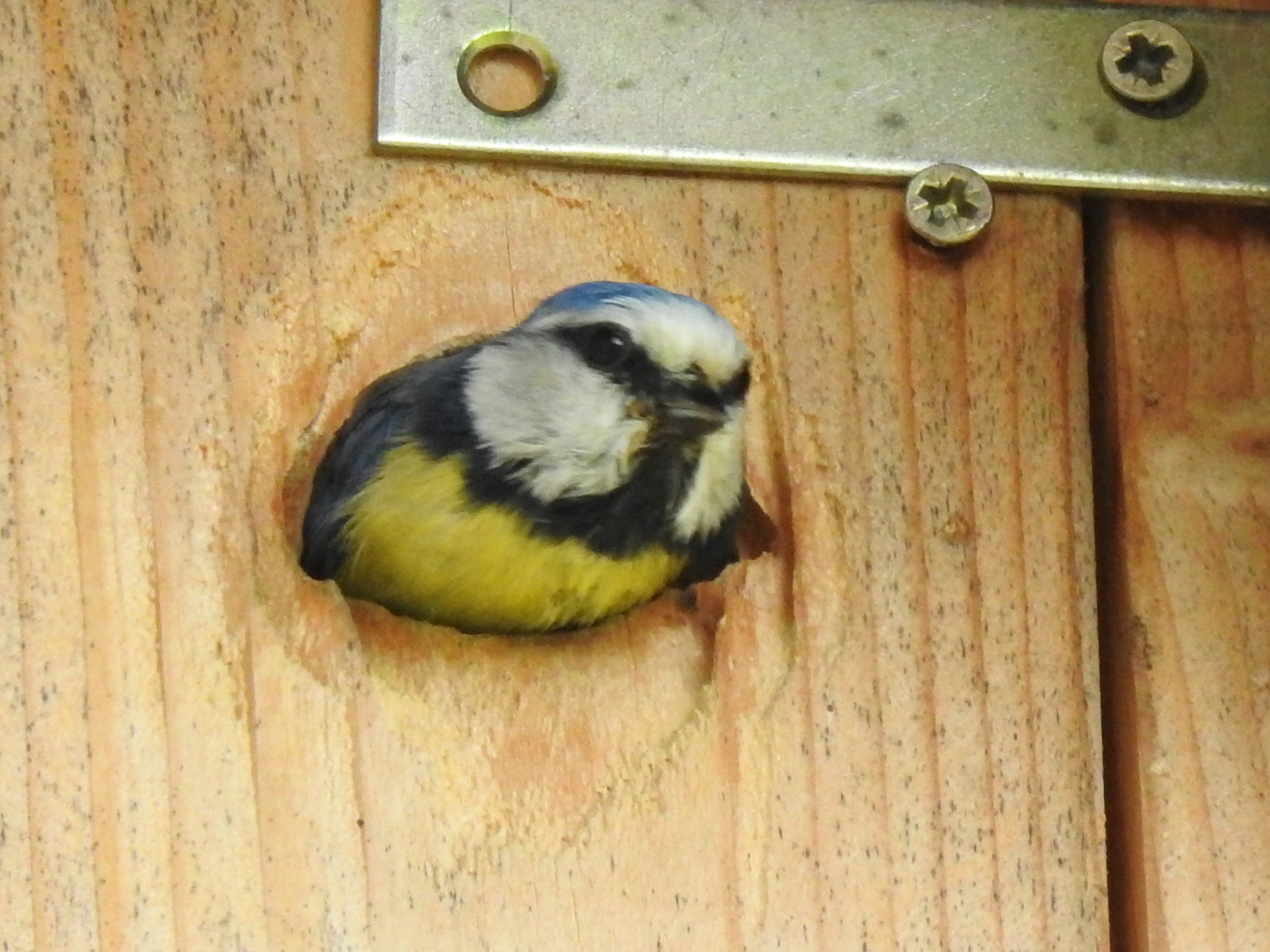 Ein paar Tage noch, dann hat der kleine Nistkasten für die Blaumeisen wieder einmal seine Aufgabe erfüllt. Der eine oder andere Jungvogel wagt schon einen Blick ins Freie und wird am Einflugloch gefüttert. Sobald er satt ist, gibt er den Eingang wieder frei, und die Elternvögel können auch seine Geschwister versorgen.