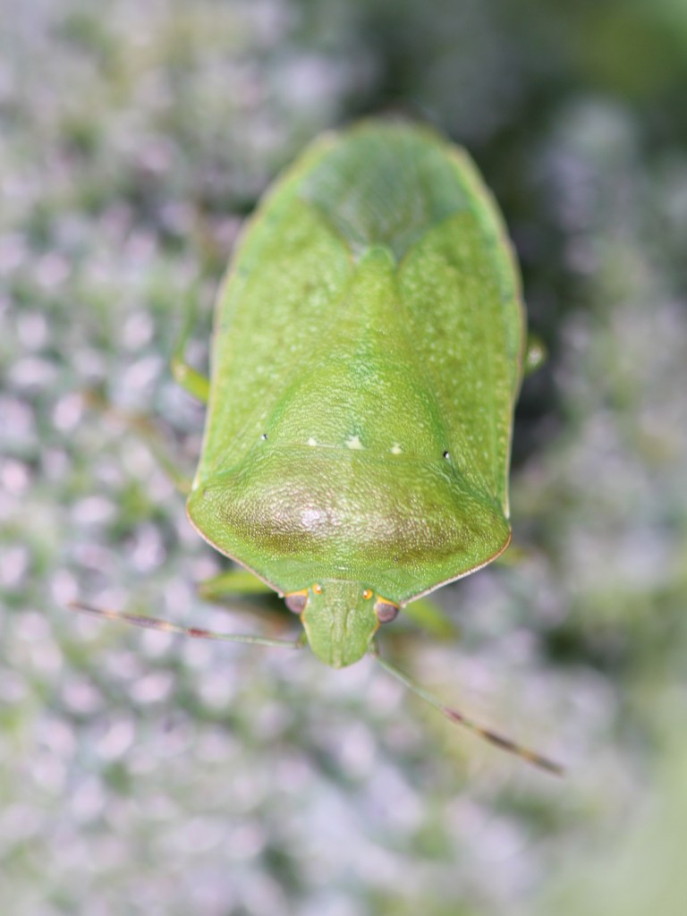 Bislang waren einfärbig grüne Wanzen bei uns im Garten immer Stinkwanzen. Dieses Jahr haben sie eingewanderte Konkurrenz bekommen. Die invasive Grüne Reiswanze ist dabei von der einheimischen Grünen Stinkwanze kaum zu unterscheiden. Auf der folgenden Gegenüberstellung sieht man auf dem ersten Bild, dass die Reiswanze drei kleine weiße Punkte am vorderen Rand des Scutellums hat, die der Stinkwanze auf dem zweiten Bild fehlen.