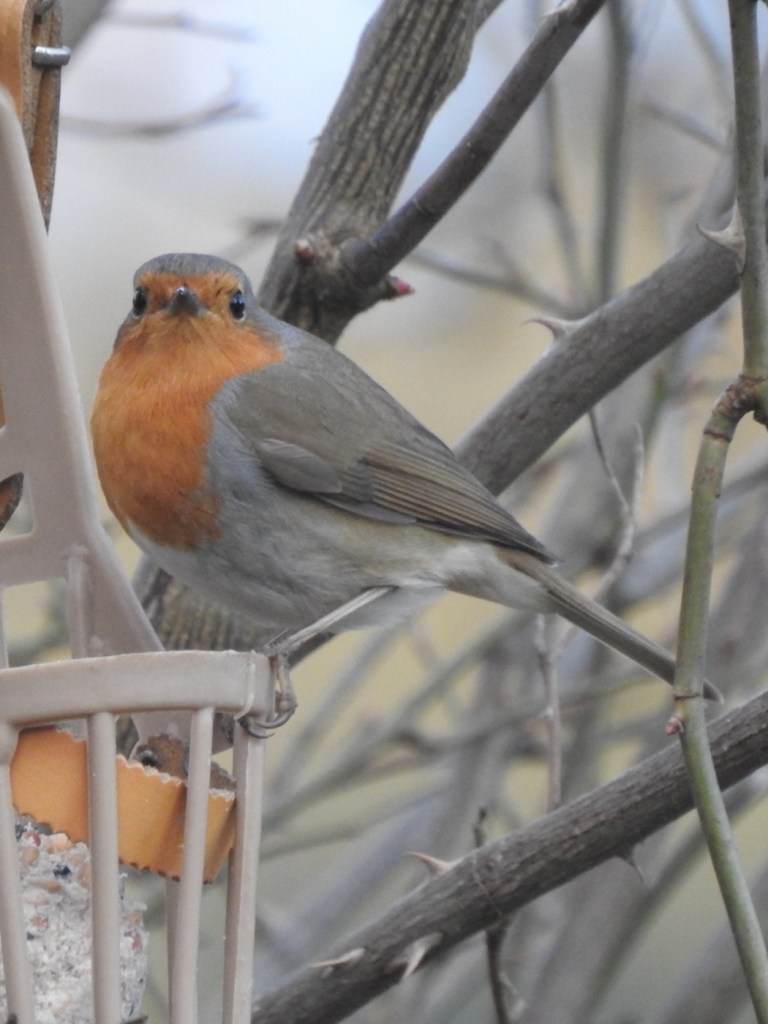 Neulich saß ich nach getaner Gartenarbeit noch ein bisschen in der Dämmerung und beobachtete einen Schatten an den Meisenknödeln. Auf die Distanz sind meine Augen nicht mehr so gut, aber das Teleobjektiv versicherte mir nicht nur, dass es wirklich das Rotkehlchen war, es zeigte mir auch, dass man nach Sonnenuntergang noch halbwegs passable Fotos machen kann. Das Licht ist weich und hat um diese Zeit einen höheren Rotanteil, das bringt das Brustgefieder gut zur Geltung.