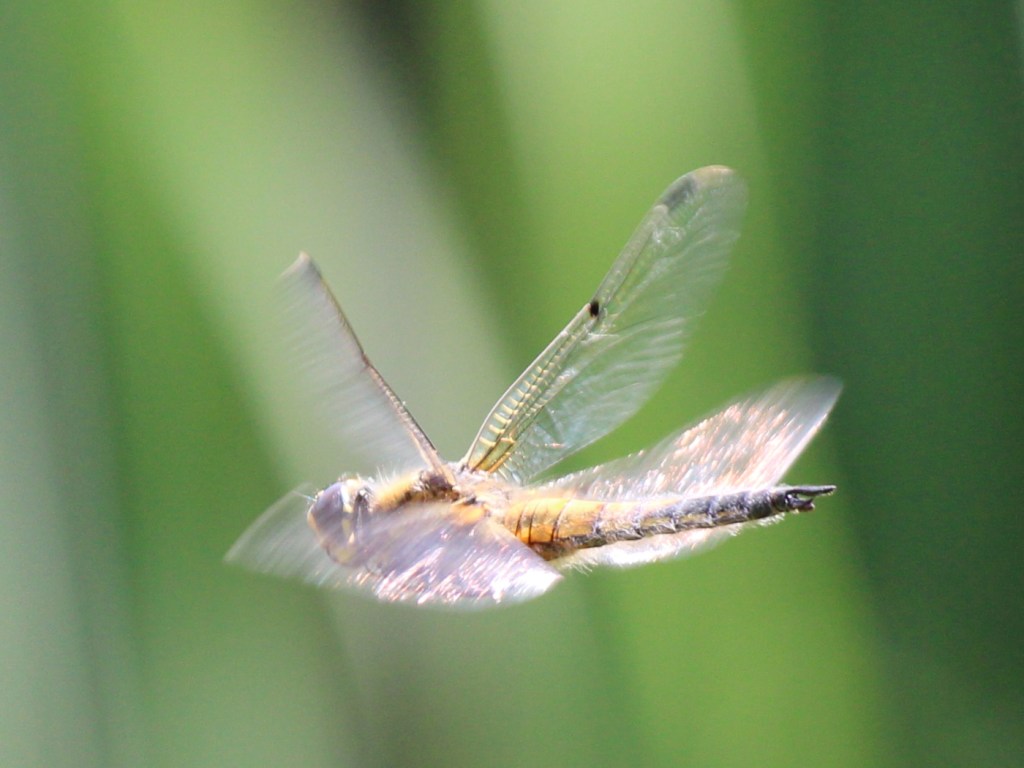 Mittlerweile ist auch ein blau gefärbtes Plattbauchmännchen aufgetaucht und hat den Vierfleck verdrängt. Für die nächste Generation hat der Vierfleck aber ein paar Tage Vorsprung herausgeholt, und wenn die Larven diesen nicht verspielen, wird eine von ihnen im nächsten Jahr wieder die erste dominante Segellibelle sein, die über dem Teich kreist.