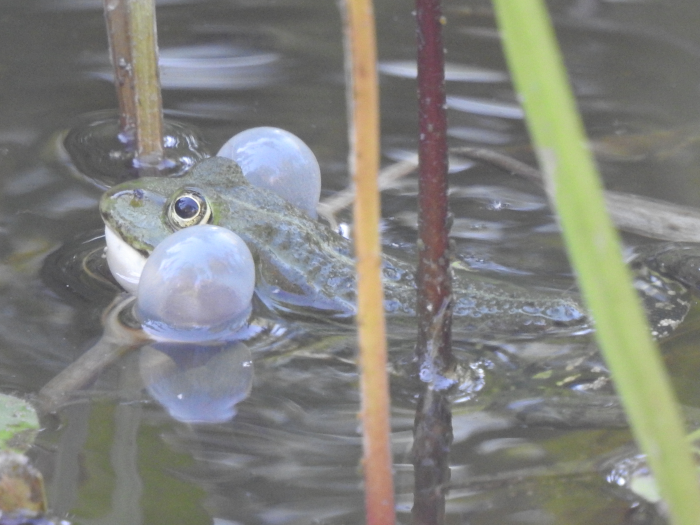 Schlangen sind aber nicht jedermanns Sache. Unser Teichfrosch hat eine angeborene Abneigung – und das mit Recht. Ich habe ihn schon wild herumspringen sehen, um in der Randbepflanzung einer ganz kleinen Ringelnatter auszuweichen. Die meiste Zeit übt er sich aber in Geduld. Er weiß, dass man ihn regungslos zwischen den Pflanzen kaum erkennt, und ein bisschen verlässt er sich sicher auch auf seine für einen Frosch mittlerweile imposante Größe. Bauch macht Ansehen, hätte meine Oma gesagt.